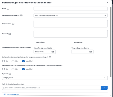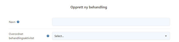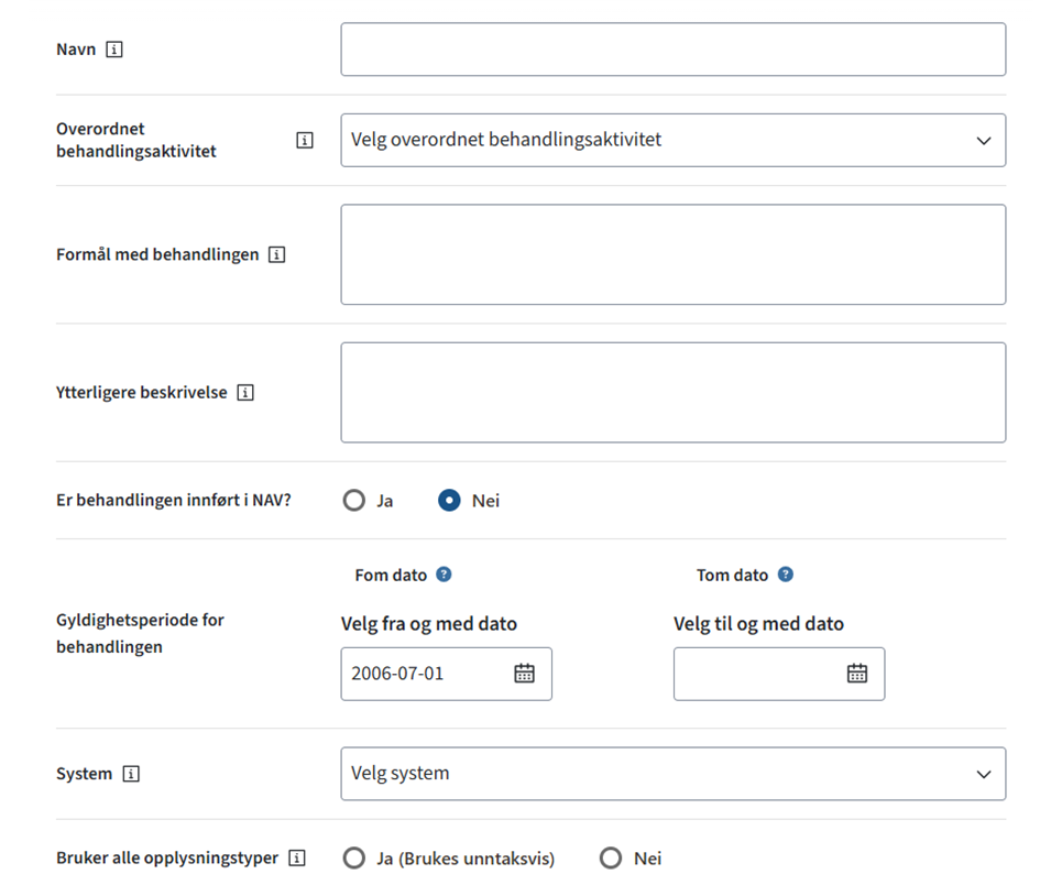 Registreringsbildet i Behandlingskatalogen ser slik ut. Det er lagt inn hjelpetekster til de ulike feltene som kommer frem når man holder musepekeren over det blå ikonet med et spørsmålstegn.