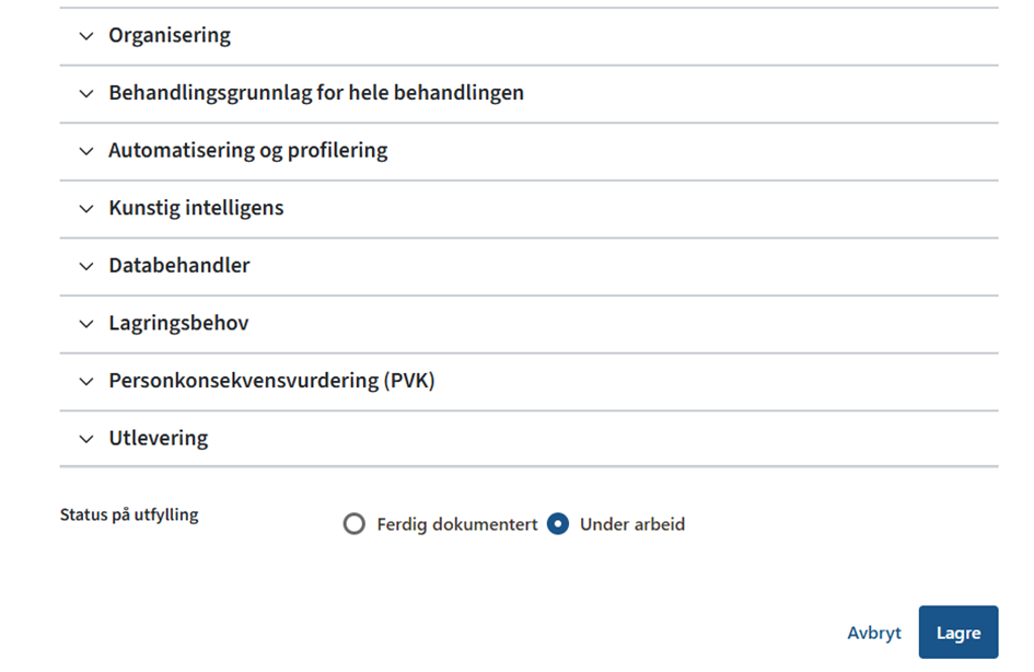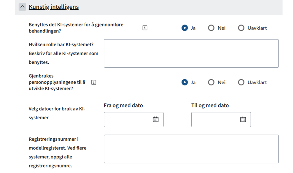 Under dette punktet skal det registres om KI-systemer benyttes for å gjennomføre behandlingen. Svar «Ja», «Nei» eller «Uavklart» i dette feltet. Dersom du svarer «Ja», må du samtidig beskrive hvilken rolle KI-systemet har. Benyttes flere KI-systemer skal alle beskrives. Dersom du svarer «Uavklart», skal dette undersøkes omgående og oppdateres i registreringen.