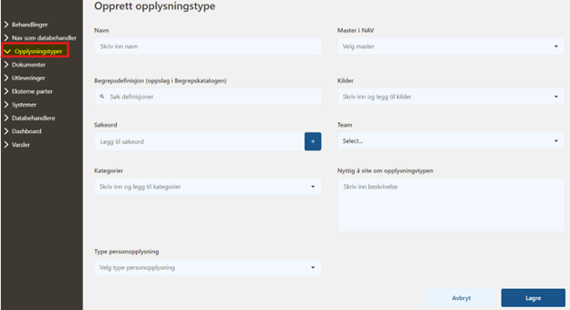 Dersom det brukes en opplysningstype som ikke står i oversikten, kan denne legges til under «Opplysningstyper» i venstremenyen (se markering på bildet nedenfor) og deretter ved å trykke på «Opprett ny» på høyre side.
