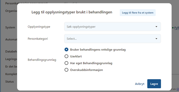 Angi i hvilke systemer personopplysninger behandles. Med systemer mener vi både interne og eksterne IT-systemer, apper, skytjeneser og plattformer og fysiske og digitale arkiv. Dersom du ikke finner systemet i nedtrekksmenyen i løsningen, må det bes om at det aktuelle systemet legges til, i kanalen #behandlingskatalogen på Slack.