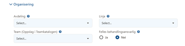 Oppgi navn på avdelingen og enheten/seksjonen i avdelingen eller i styringslinjen der det operative ansvaret for fagområdet/behandlingen ligger. Dersom det er aktuelt kan det også registreres hvilket utviklingsteam som er ansvarlig for behandlingen.