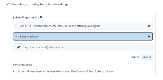Hvis det rettslige grunnlaget for behandlingen er rettslig forpliktelse etter Art. 6 (1) c eller offentlig myndighetsutøvelse etter Art. 6 (1) e, åpnes et nytt felt for å registrere dette. Det supplerende rettsgrunnlaget skal finnes i norsk lovgivning, og bør angis så presist som mulig. Kan man peke på en bestemt lov- og forskriftsbestemmelse, bør denne oppgis.