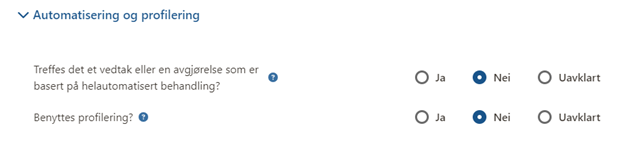 Tas det avgjørelser som gjelder en person uten at det gjøres noen menneskelige vurderinger, må det angis at behandlingen er helautomatisert. For at det skal være snakk om en helautomatisk avgjørelse, må det dreie seg om avgjørelser som har rettsvirkninger eller som har store konsekvenser for den enkelte. Under dette punktet registreres det «Ja», «Nei» eller «Uavklart». Dersom det registreres at det er uavklart, må dette avklares omgående og etterregistreres. Områder der vedtaksprosessen i dag er helautomatisert, er barnetrygd, pensjon og foreldrepengeområdet.