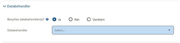 Dersom det benyttes databehandlere, skal dette oppgis her. Svar «Ja», «Nei» eller «Uavklart» i dette feltet. Dersom du svarer «Ja», skal databehandleren velges fra nedtrekksmenyen. Dersom du svarer «Uavklart», skal dette undersøkes omgående og oppdateres i registreringen.