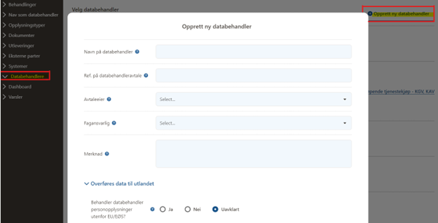 Hvis ikke databehandleren er oppført i nedtrekksmenyen, kan den legges til under «Databehandlere» i venstremenyen (se markering på bildet nedenfor) og deretter «Opprett ny databehandler» (se markering på bildet nedenfor). Du skal da også registrere om databehandleren behandler personopplysninger utenfor EU/EØS, og ev. i hvilket land.