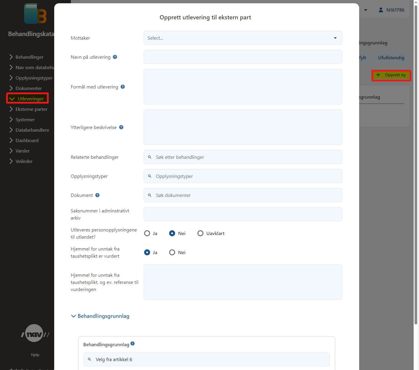 Utleveringene Nav gjør skal være tilgjengelig nedtrekksmenyen i løsningen. Hvis ikke du finner den der, går du inn på «Utleveringer» i venstremenyen (se markering på bildet nedenfor) og deretter «Opprett ny» til høyre i løsningen (se markering på bildet nedenfor).