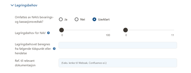 Etter personvernforordningen skal personopplysninger ikke lagres lenger enn nødvendig for å gjennomføre formålet de er samlet inn for. Etter det skal de slettes. Det er hovedregelen med mindre annen lovgivning pålegger lengre lagringstid, som for eksempel arkivlovgivning og regnskapslovgivning. Oppgi om behandlingen omfattes av Navs bevarings- og kassasjonsvedtak og hvor lenge opplysningene skal lagres. Vis til begrunnelsen for lagringstid ved å legge inn referanse til aktuelt skjema for lagring på Confluence eller i Public 360.
