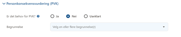 Oppgi om det er behov for PVK ved å velge «Ja», «Nei» eller «Uavklart». Dersom det angis at det er «Uavklart» må dette vurderes omgående og oppdateres i løsningen. Hvis det er behov for å gjennomføre PVK skal referansen til PVK-en i Public 360 legges til. Hvis man kommer til at det ikke er behov for å gjennomføre PVK, må det velges en begrunnelse for dette.