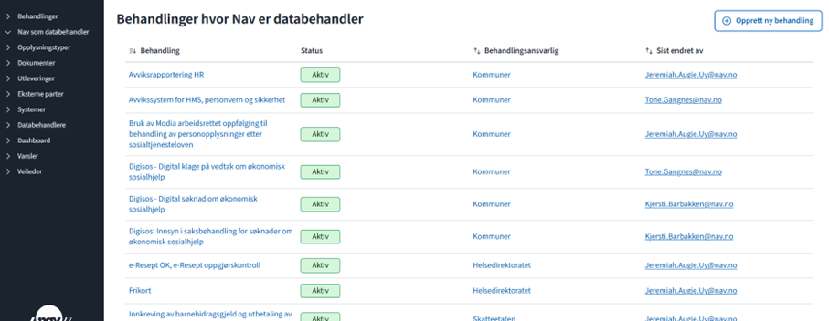 Når Arbeids- og velferdsetaten (Nav) er databehandler på vegne av andre offentlige virksomheter, skal alle behandlingsaktiviteter som utføres på vegne av en behandlingsansvarlig også registreres i Behandlingskatalogen. Et eksempel er der kommunene benytter seg av Arbeids- og velferdsetatens IT-systemer til eget bruk. Etaten som databehandler vil kun ha tilgang til kommunale opplysningene som drifter og forvalter av IT-systemet og kan ikke behandle disse til egne formål. Det er en forutsetning at det foreligger en skriftlig databehandleravtale med behandlingsansvarlig. Registreringen gjøres i «Nav som databehandler» i venstremenyen (se markering på bildet nedenfor) og deretter ved å trykke på «Opprett ny behandling» på høyre side.