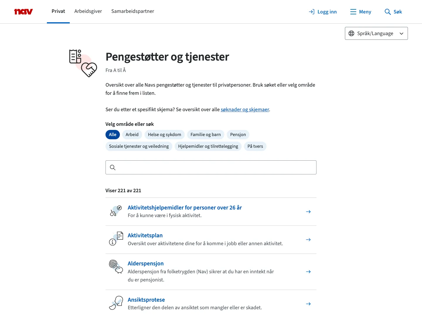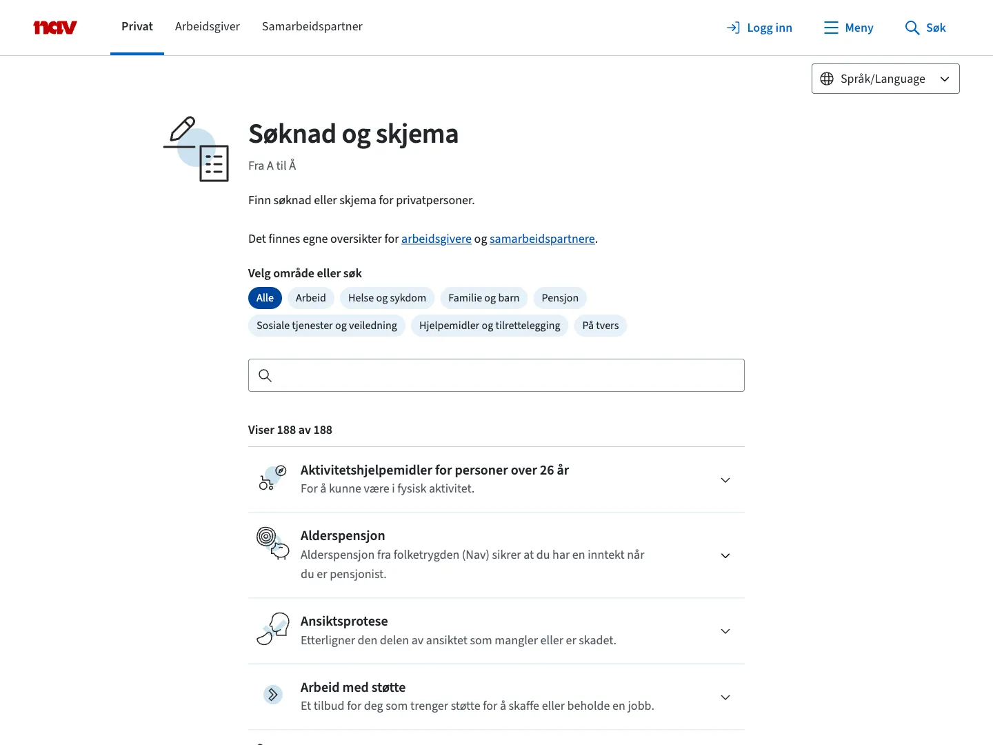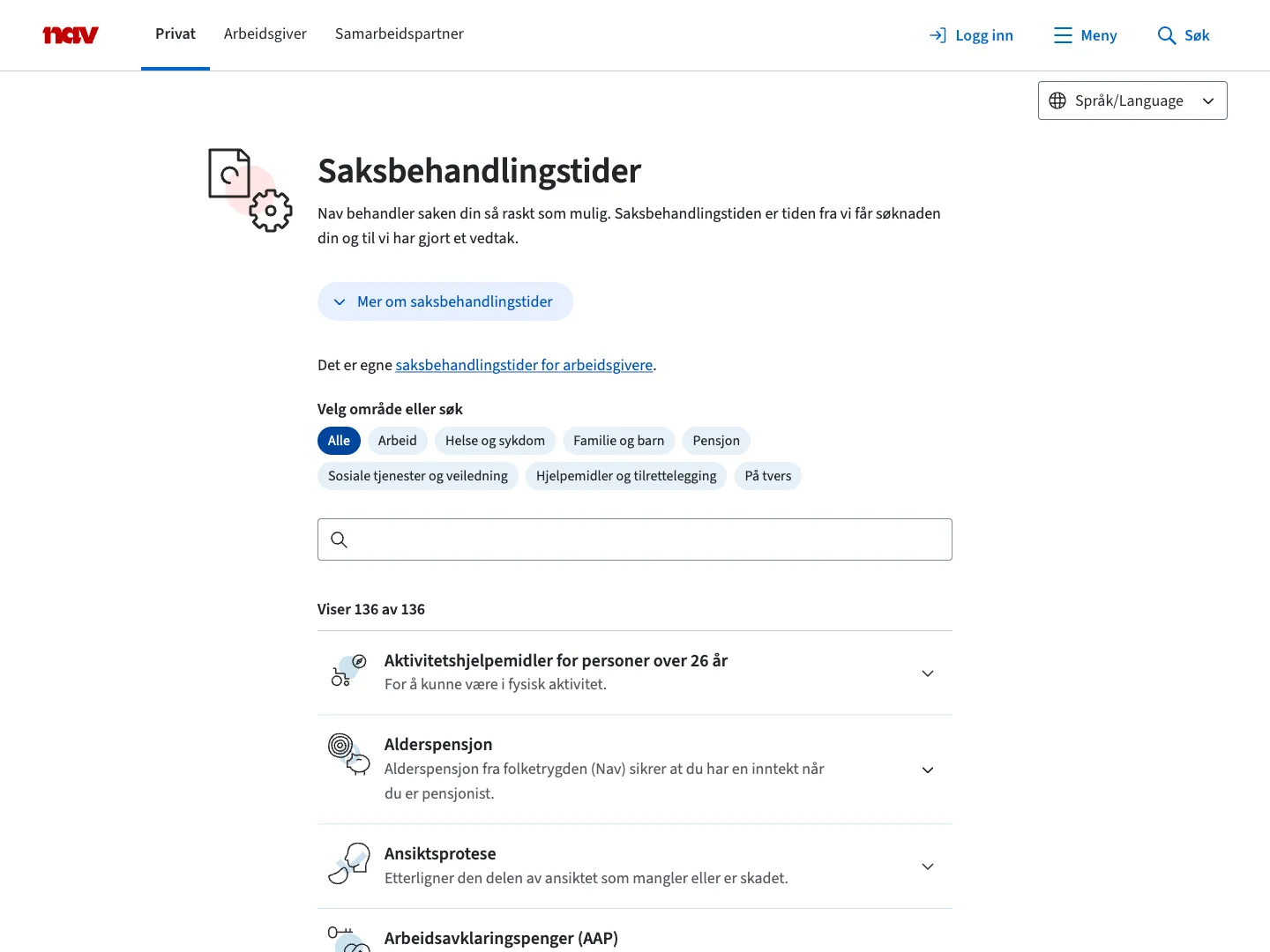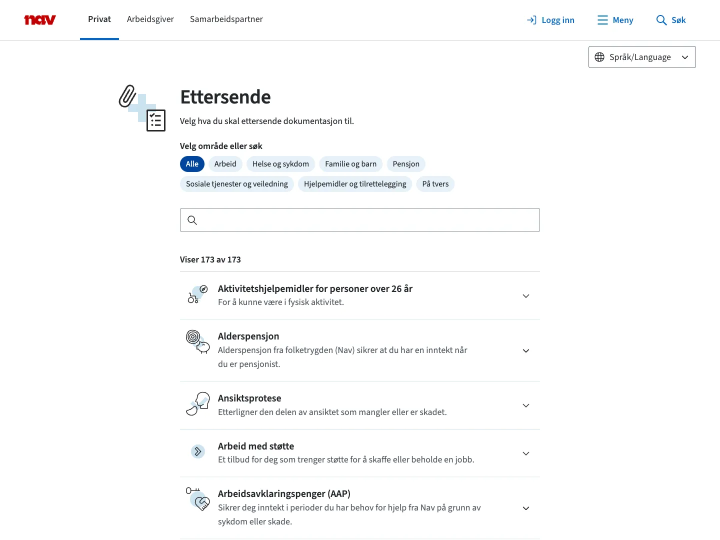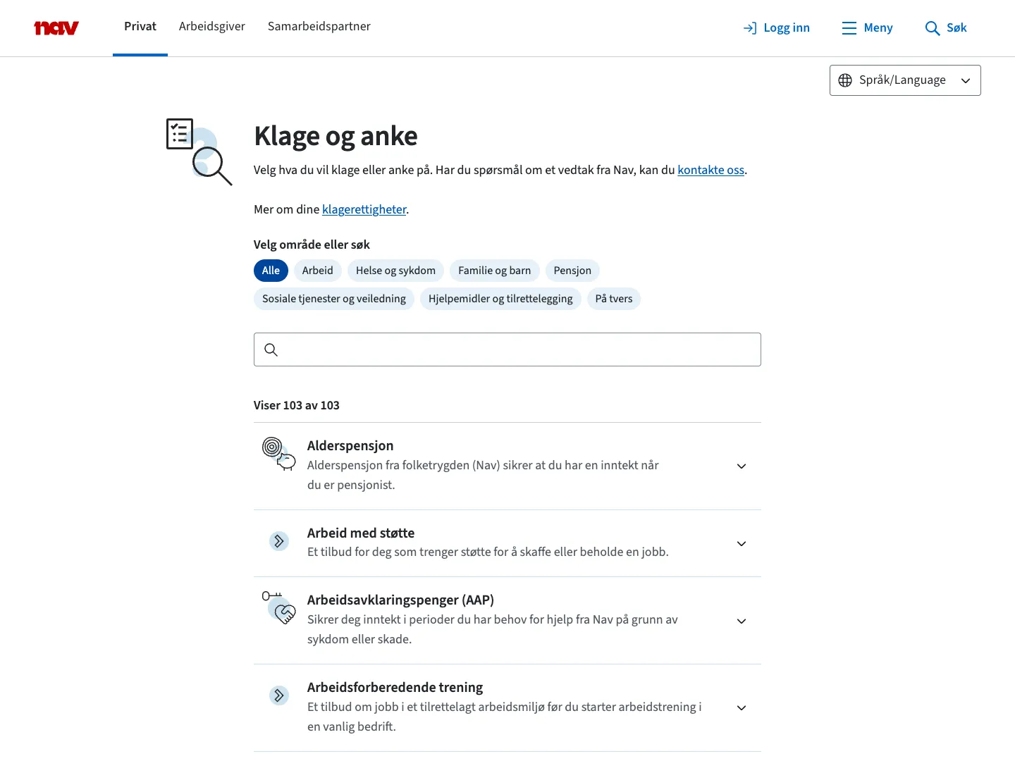 Målet er at det skal bli enklere for brukerne å finne frem i oversiktene, og enklere for teamet å forvalte sidene. Vi har redusert antall filtervalg, skrevet tydelige beskrivelser og fjernet unødvendig ekspandering.