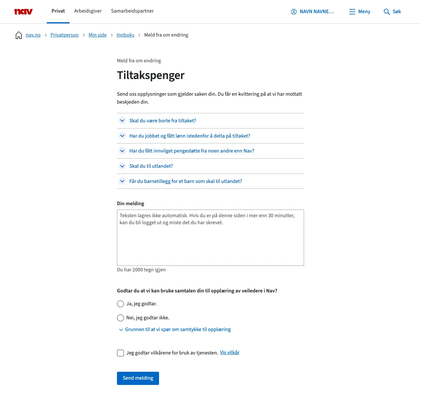 Kontaktsenteret får omtrent 60.000 henvendelser i meldingstjenestene «Skriv til oss» og «Beskjed til oss» hver måned. Team nav.no og Nav kontaktsenter samarbeidet å utvikle en ny, forbedret flyt for disse meldingene. Målet er bedre brukeropplevelse og mer presis sortering av henvendelsene, slik at de blir litt enklere å håndtere for Nav kontaktsenter.