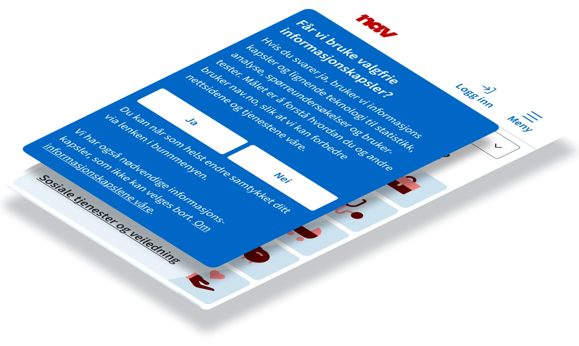På grunn av endringer i ekomloven, fikk vi i januar på plass et cookie-banner og en cookie-erklæring på nav.no. I banneret ber vi om samtykke til bruk av valgfrie informasjonskapsler og lignende teknologi, som vi bruker for å få innsikt i hvordan nettstedet og tjenestene våre blir brukt.